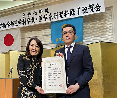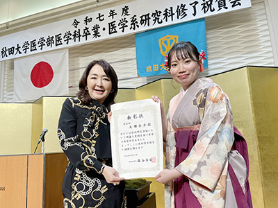 太田さんと清水さん 秋田大学奨励賞 【NEW!】医学部6年生の太田奈歩さんと清水紀翔さんが秋田大学奨励賞を受賞 医学部6年生の太田奈歩さんと清水紀翔さん 秋田大学奨励賞を受賞しました! 二人は医学部2年生から6年生まで公衆衛生学講座に在籍し、数々の学会発表や論文を発表しました。おめでとうございます! → 学生の活躍のページへ 2026年4月6日 update 修士2名 博士3名 新たに誕生 【NEW!】ご卒業おめでとうございます! ・修士Milliet Kupfuwa さん後藤豊美さん ・博士岩澤敦史さん竹之下千尋さん野尻恵資さん それぞれの道で、秋田で学んだことを活かして大きく羽ばたいてください。 → メンバーのページへ 2026年4月6日 update 大関千潤さん 論文掲載 【NEW!】研修医2年目 大関千潤さん 大関千潤さんの論文が Menopause に掲載されました!おめでとうございます。 → 学生の活躍のページへ 2026年4月6日 update 日本衛生学会 当講座より発表 【NEW!】野村教授、鄭助教、富永助教 日本衛生学会にて、野村教授が大迫研究の生殖因子と脳容積を、鄭先生が仙北市の高齢者デジタルデバイドの健康について、富永先生が雪印メグミルクとの協働研究を発表を行いました。 → 業績のページへ 2026年4月6日 update 感染制御総合センターシンポジウム 当講座より鄭助教が登壇 令和7年度 秋田大学大学院医学系研究科附属 感染制御総合センターシンポジウム「知とのつながりで築く平時の備え―感染症に強い秋田をめざして―」が1月10日秋田大学にて開催されました。 当講座より鄭松伊助教が「感染流行時の閉じこもりのメンタルヘルス 現在とこれから」と題して発表しました。 また、パネルディスカッションも行われ、感染疫学部門長である野村恭子教授が当講座よりパネリストとして参加しました。 → シンポジウム詳細 2026年01月19日 update オンラインシンポジウム 開催 メンタルヘルス・自殺対策シンポジウム 1月30日~31日 野村教授、秋田大学の学生メンタルヘルス・自殺対策を発表 どなたでも、無料でオンライン参加可能です。奮ってご参加ください。 → PDF(申込QRコードはこちら) 大学共同利用機関法人 情報・システム研究機構 統計数理研究所の2025年度共同研究集会「自殺対策基本法20周年に向けて:学際的検討と現場の経験を踏まえての政策提言」は1/30(金)10:00-17:00、1/31(土)9:00-16:00の2日間、ハイブリッド開催です。参加は無料ですが、申し込みが必要です(上のリンク内QRコードよりどうぞ)。 2026年01月06日 update 大学院生 竹之下千尋さん 論文掲載 BMC Women’s Health 博士課程大学院生 竹之下千尋さんの論文 Development and validation of a premenstrual symptom screening tool for working women in relation to absenteeism が BMC Women’s Health に掲載されました!おめでとうございます! → 学生の活躍のページへ 2026年01月09日 update 大学院生 野尻恵資さん 論文掲載 Current Development in Nutrition 博士課程大学院生 野尻恵資さんの論文 Human Milk Macronutrient and Energy Contents Are Associated with Maternal and Infant Factors: A Cross-Sectional Analysis of Data from the Japanese Human Milk Study Cohort が Current Development in Nutrition に掲載されました!おめでとうございます! → 学生の活躍のページへ 2026年01月09日 update Milliet Kupfwaさん 論文掲載 秋田県公衆衛生学雑誌 修士課程大学院生Milliet Kupfwaさんの論文「高塩分摂取に関連する要因:秋田県在住者を対象とした横断研究 Factors associated with high salt consumption:A cross-sectional study among residents of Akita Prefecture」が秋田県公衆衛生学雑誌に掲載されました!おめでとうございます! → 学生の活躍のページへ 2026年01月09日 update AMEDセミナー 開催決定 TKP小倉シティセンター KOKURAホールにて 「働く人のためのヘルスケアサービスを選ぶワークショップ ~”感覚”から”科学”へ、医学会発指針で見極める~」として対面型のセミナーの開催が決定しました。 『「働く女性の健康指針」の概要及び活用方法について』と題して当講座 野村恭子 教授が基調講演を行います。 開催日時は 2026年1月29日13:00-16:00(予定)、12:30 受付開始、参加は無料ですが参加登録が必要です。 → 国立研究開発法人 日本医療研究開発機構のページへ(リンク先の下の方より参加登録できます) 2025年12月19日 update 社会医学専門医プログラム 認定 秋田大学大学院研修型プログラム 社会医学専門医プログラムとして「秋田大学大学院研修型プログラム」が一般社団法人 社会医学系専門医協会より2025年11月18日付で認定されました。 → 一般社団法人 社会医学系専門医協会のページへ 医学博士と、産業医と、社会医学専門医の3つが同時に取得できます! 秋田県内居住で実習や講習会に参加ができることが条件となります。 2025年12月19日 update 大学院生 マリーナさん 奨励賞受賞 第36回外国人による日本語スピーチコンテスト 秋田ユネスコ協会主催 2025年11月16日、秋田市にて「第36回 外国人による日本語スピーチコンテスト&世界と語ろう!ユネスコタイム」が開催され、当講座の大学院生 Marina Israel さんが奨励賞を受賞しました。おめでとうございま