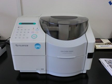 | 【設置場所】 クリーンマウス実験室 【機種名】 富士ドライケム3000V(富士フィルム社製) 【用途】 動物の血漿・血清中の酵素及び一般生化学的項目を 検査できる。検査項目できる項目はこちらを参照。 【使用方法】 取り扱い説明書を参照 【使用上の注意】 使用済みのチップとスライドは自動的に廃棄ボックスに捨てられますが、ボックスが満杯のまま使用しますと機械の故障につながります。 使用後は廃棄ボックスを空にして下さい。 【利用料金】 200円/1項目/1検体 (検査用スライド、専用のチップおよびチューブを含む) 各試薬の料金等の詳細は試薬の料金を参照。 |