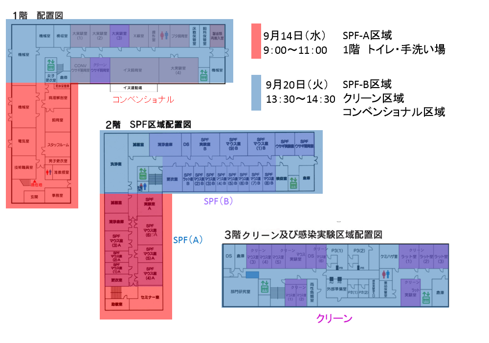 ※当日、クリーン飼育室、コンベンショナル区域に立ち入った方はSPF-B区域には入れません。
