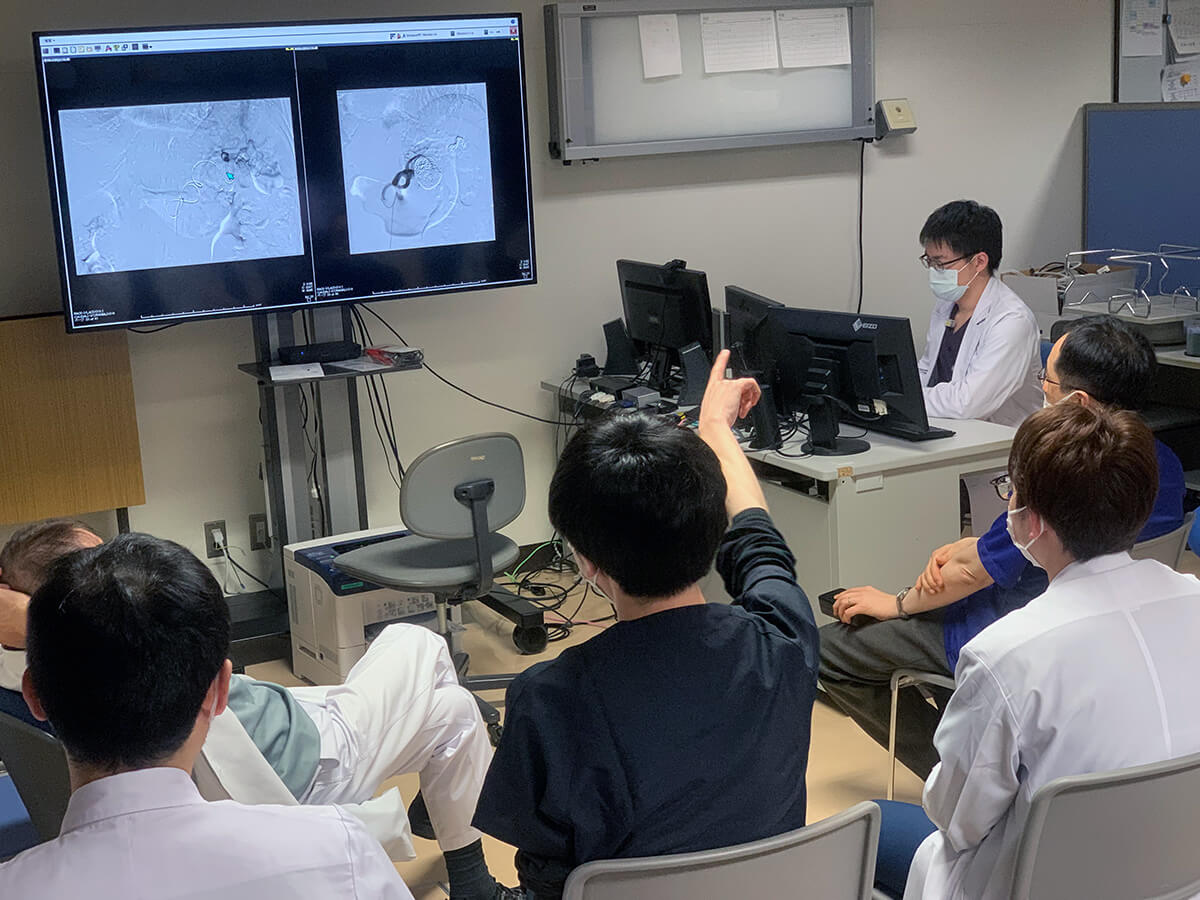 業務内容としては、CT、MRI、核医学検査の読影、interventional radiology(IVR)、放射線治療を行っています。我々は放射線医学の最も大きな特徴は低い侵襲性であり、病気の診断、治療を行うことと考えており、常にそれを意識しながら診療にあたっています。