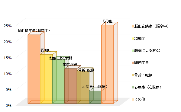脳血管障害は平成23年度の人口動態統計によると脳血管障害による死亡数は12万3867人(9.9%)で死因の第4位となっています(第1位悪性新生物28.5%、第2位心疾患15.6%)(図1)。ただし、65歳以上の寝たきり原因では第1位(図2)をしめ、介護を要する患者さんが多く、高齢化社会とも相まって大きな社会問題となっています。 脳血管障害は一般的には「脳卒中」と呼ばれ、一説には「悪い風にあったて倒れる」という意味があり、秋田では「あたる」と表現されることもあります。 脳血管障害には脳血管が破綻して出血をおこすものと、脳血管が詰まって栄養が行き渡らなくなるものがあります。ここでは代表的な病気について、当科の特色ある診療を交えて説明します。