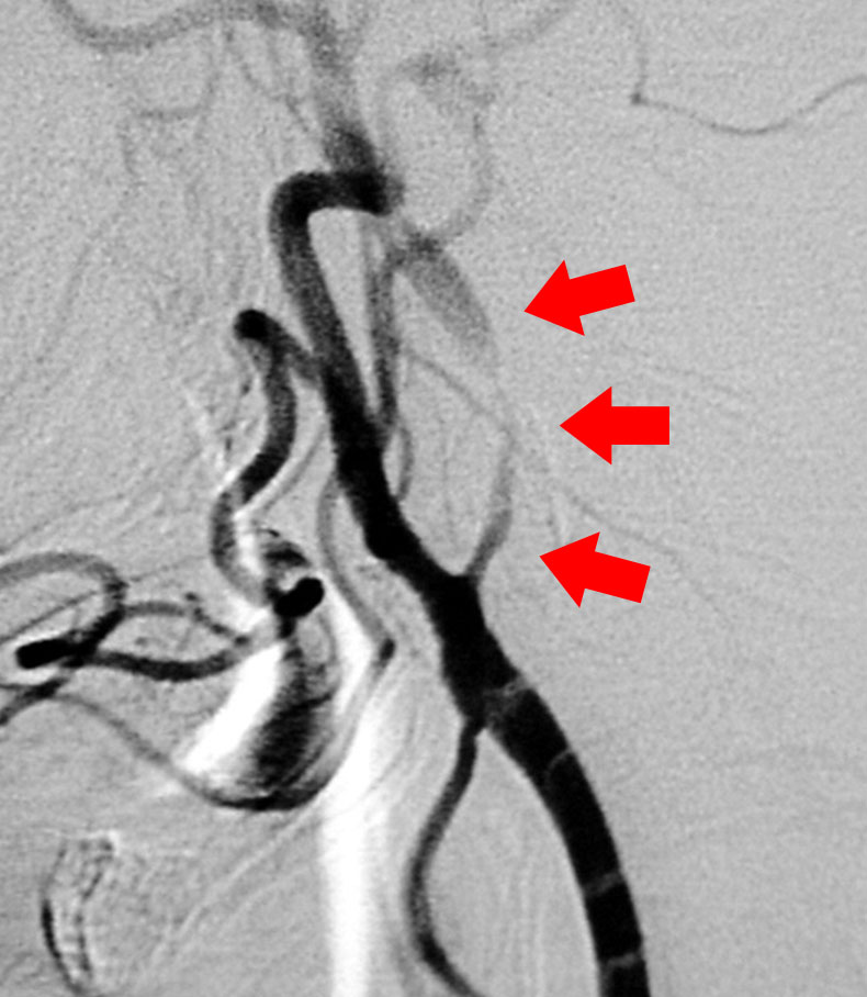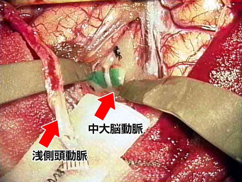 すでに詰まってしまっている患者さんに対しては症状が軽い場合であれば、頭蓋内血管と頭蓋外血管とのバイパス手術を行い、症状の悪化を予防しています(図11,図12,図13)。