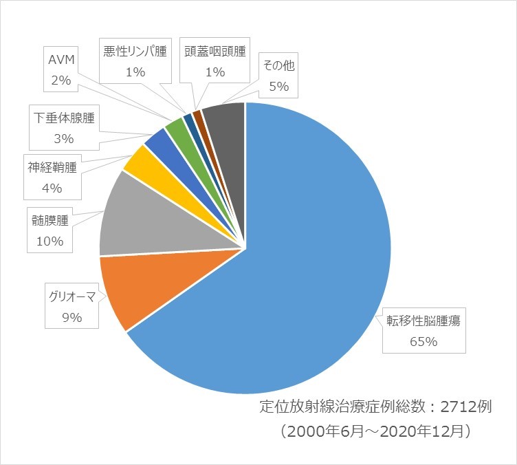 内訳は転移性脳腫瘍が約65%を占め、その他に悪性脳腫瘍、良性脳腫瘍、脳動静脈奇形を中心に治療を行っています。