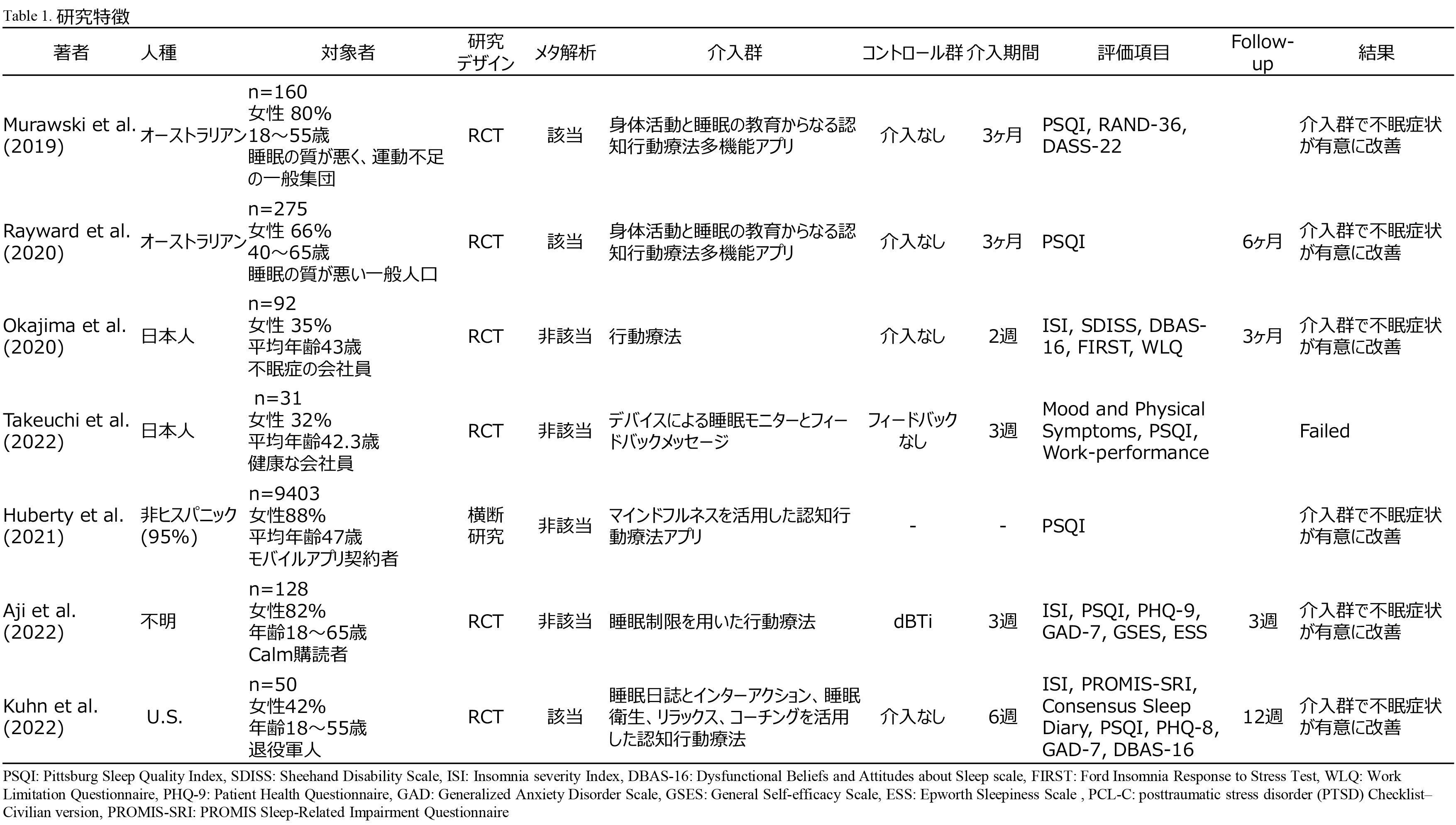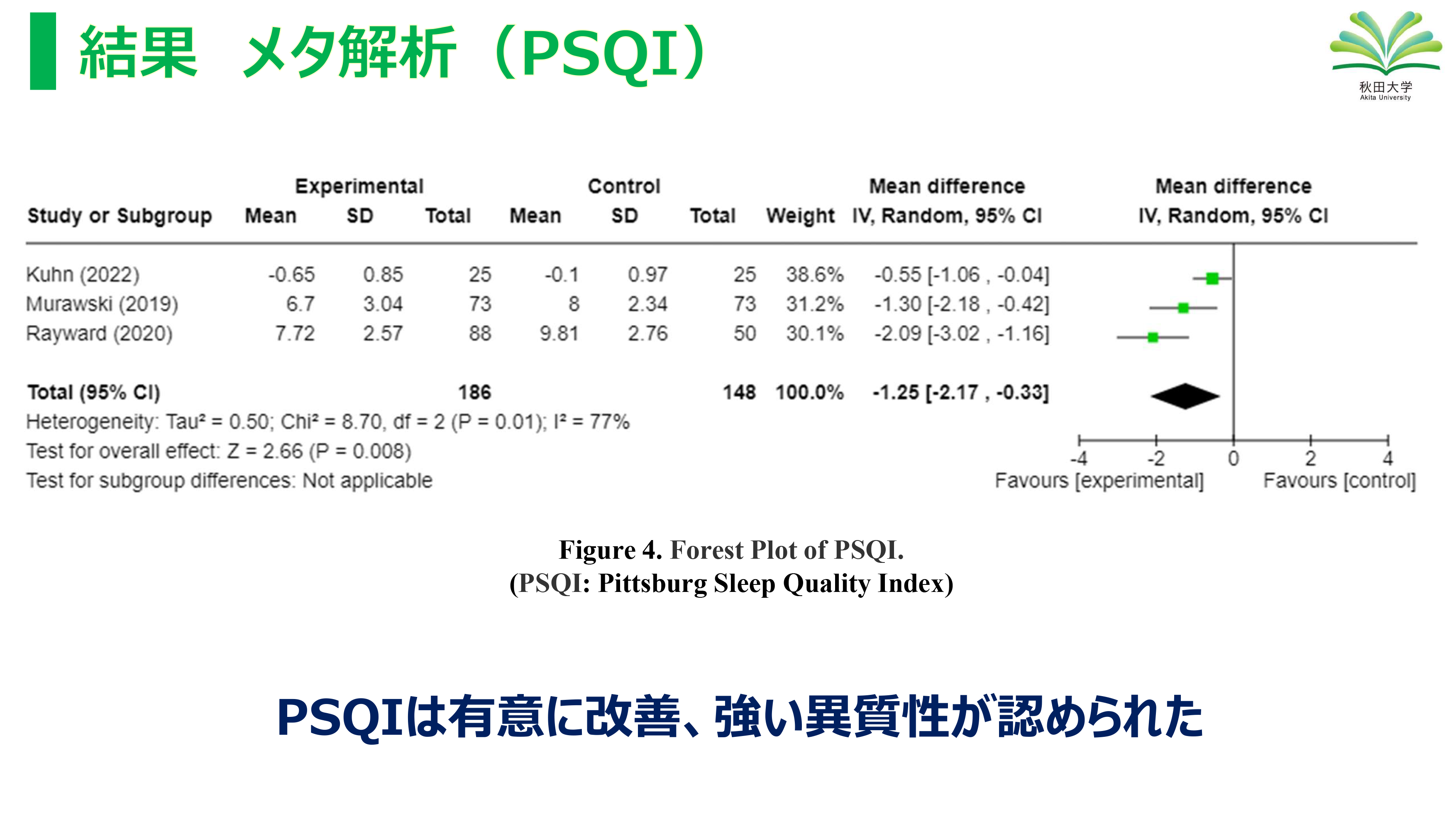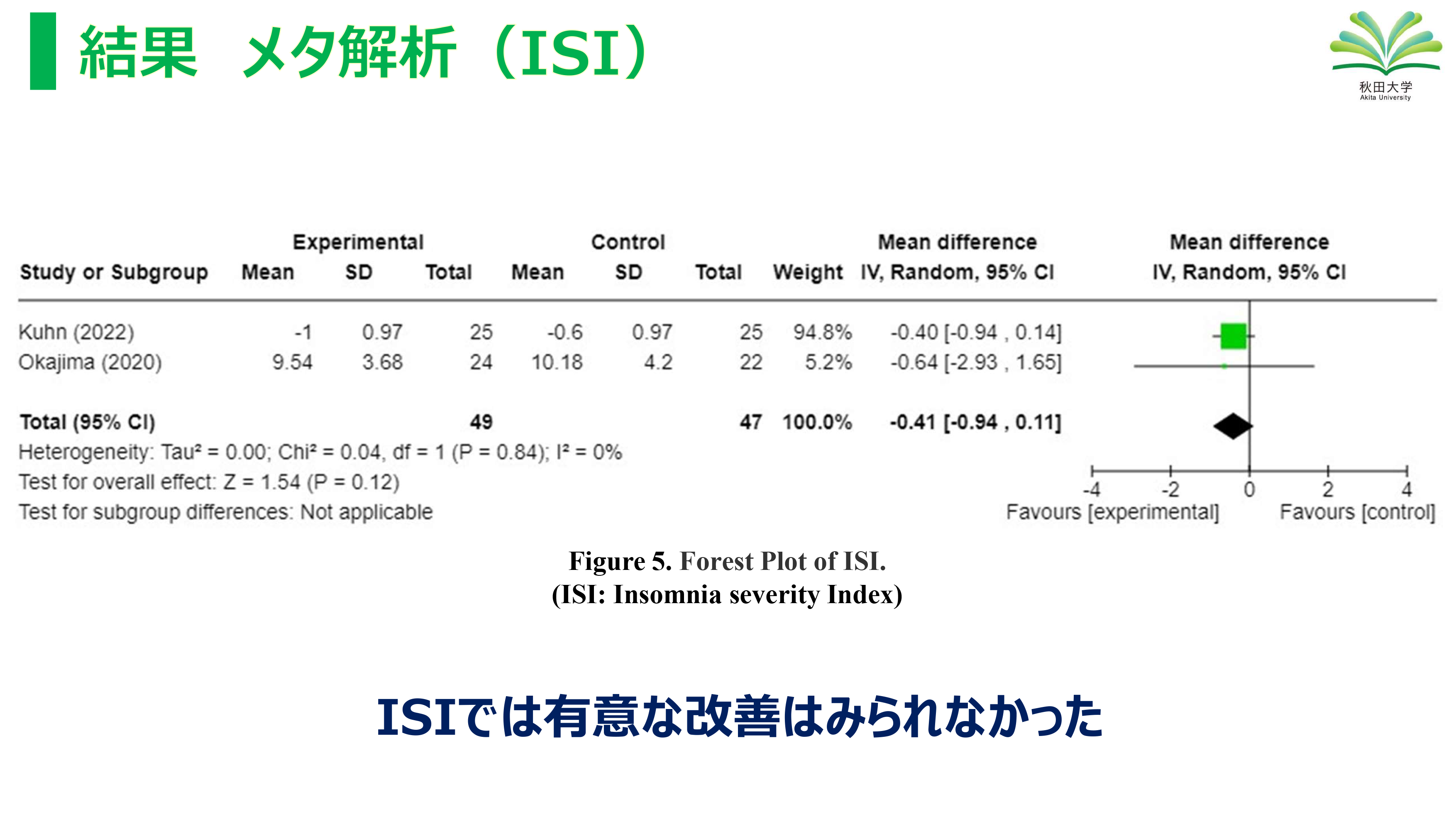 その結果、認知行動療法(CBT)に基づく3つのRCTのメタアナリシスでは、介入群はピッツバーグ睡眠質指数(PSQI)において統計的に有意な不眠症状改善を示しましたが異質性は高かった一方で、CBTに基づく2つのRCTでは不眠重症度指数(ISI)においては有意な改善は認められませんでした。
