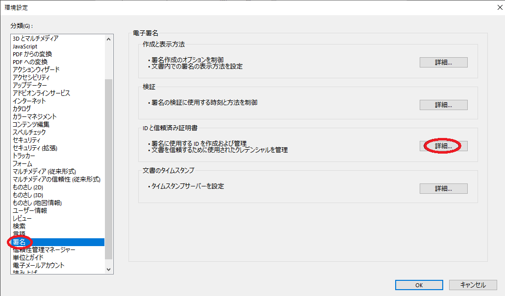 3. 「分類」の「署名」を選び、「IDと信頼済み証明書」の「詳細」をクリック