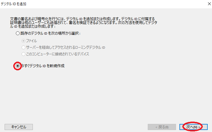5. 「今すぐデジタルIDを新規作成」を選んで「次へ」Self-Sign IDの格納場所を選択する