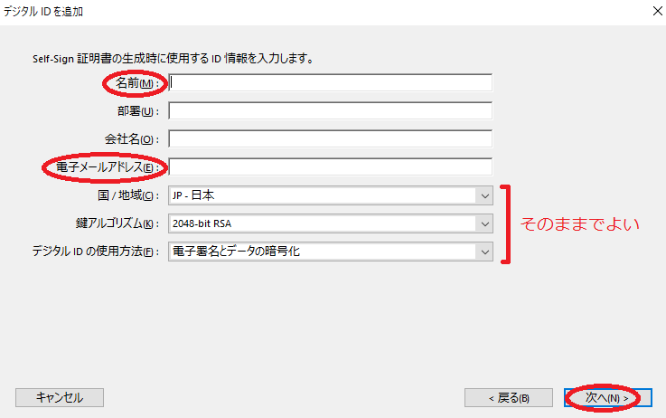 6. デジタルIDで使う名前(必須)と電子メールアドレス(必須)を入力、「次へ」