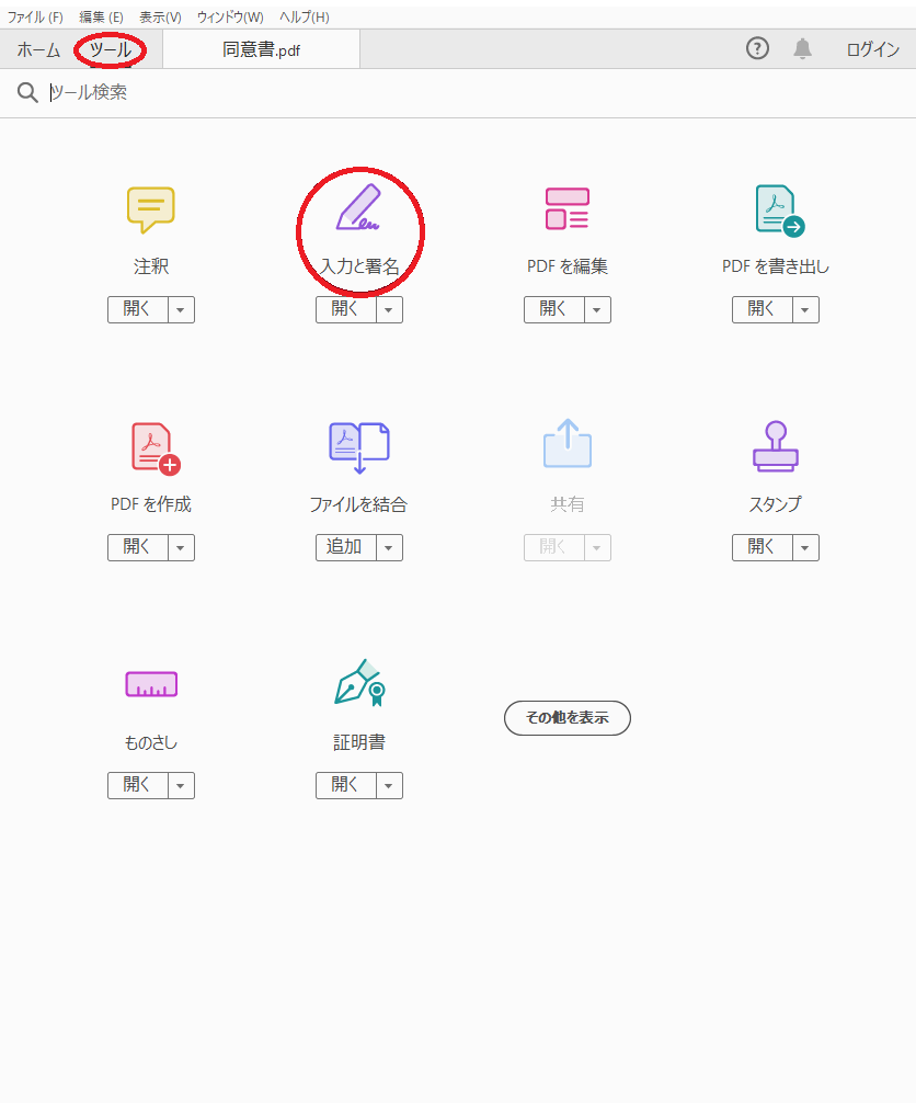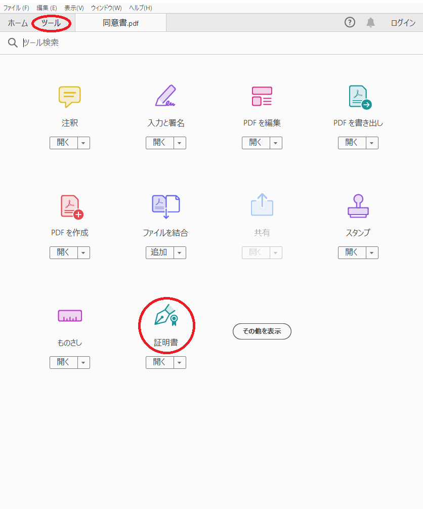 1. 「ツール」から「証明書」を選択、署名する場所でドラッグし電子署名フィールドを作る
