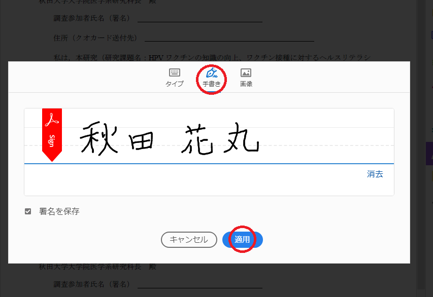 3. 「手描き」を選びマウス等でサインし、「適用」をクリック