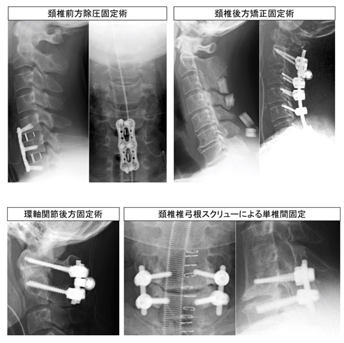 脊柱管拡大術(椎弓形成術)では、独自にデザインしたスペーサーを用いています。不安定性の生じた症例や変形のある症例では、椎弓根・外側塊スクリューを用いた後方固定術、または前方固定術などを施行し、良好な成績を得ています。