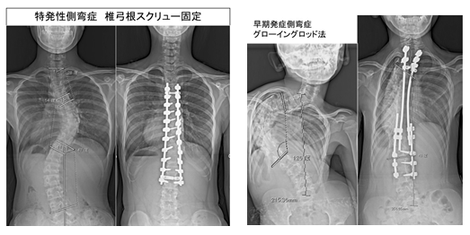 乳幼児に発症する早期発症側弯症では、グローイングロッド法を用いて、脊椎を固定せずに骨が成熟するまでの間、成長に合わせて脊椎を徐々に伸ばしていきます。