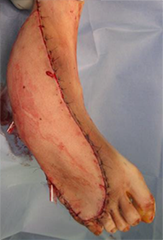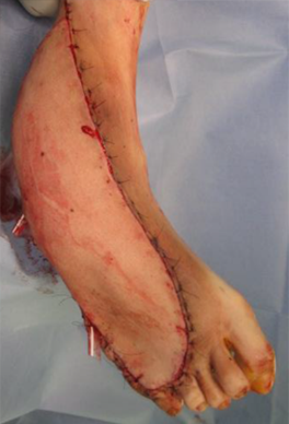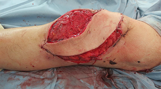 大腿部の前外側から組織を採取し、移植します。採取する組織に筋肉は含まれないため薄い皮弁が採取でき、手や足へ用いるのに適しています。