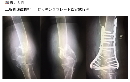 上腕骨遠位部骨折は、肘関節周囲の骨折のなかでも最も治療に難渋する骨折の一つとされています。こうした骨折に対する第一選択はロッキンプレートを用いた骨接合術ですが、高度粉砕例や偽関節例の場合には、プレート固定が困難な症例もあります。 AHGでは、必要な患者様に対して人工肘関節を施行しています。手技の確立と、人工関節の進歩により、安定した手術成績が得られています。