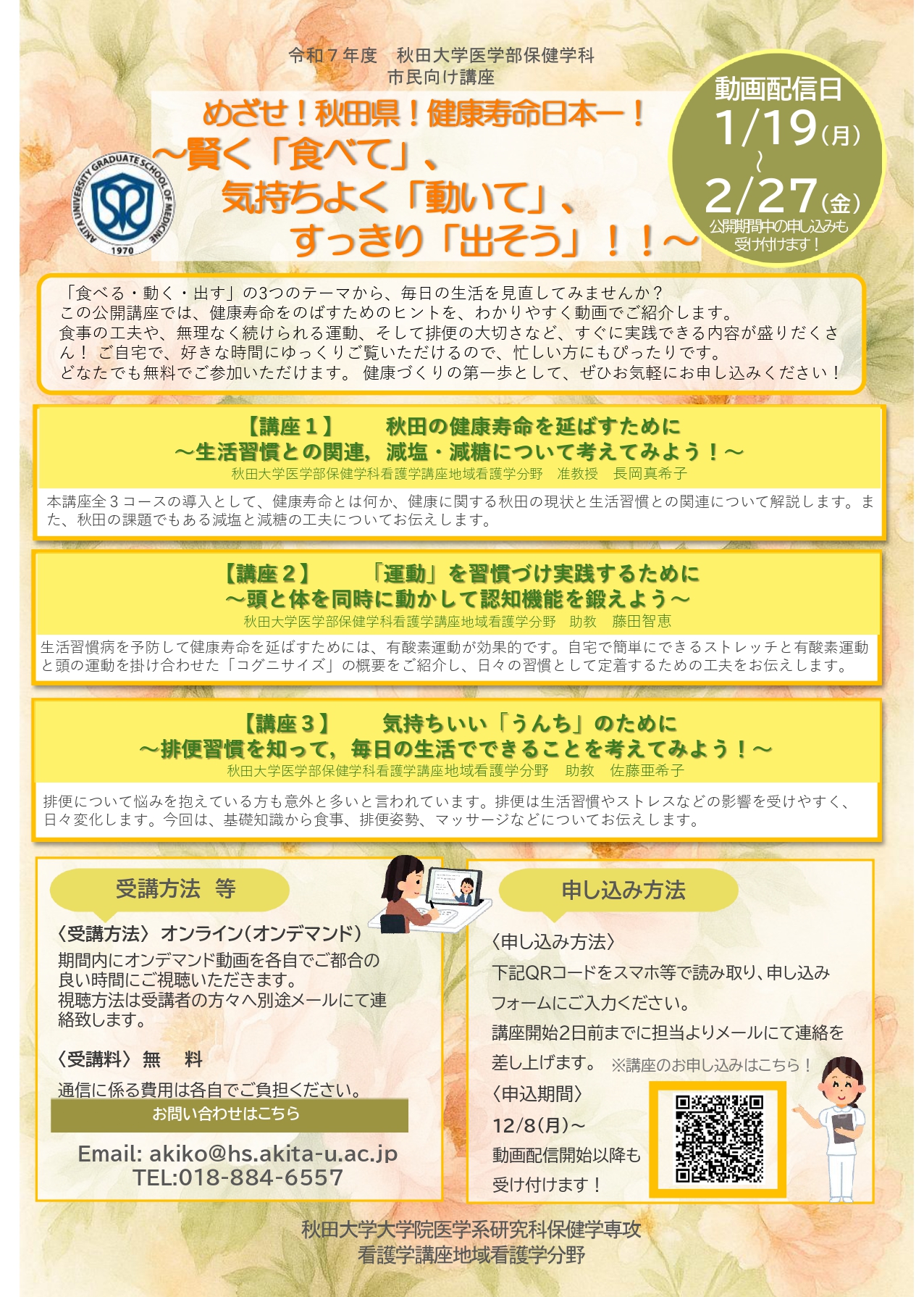 受講者募集!市民向け講座:めざせ!秋田県!健康寿命日本一!~賢く「食べて」、気持ちよく「動いて」、すっきり「出そう」!!~