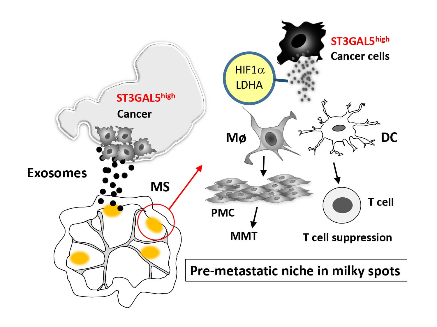 腹膜播種は胃癌や膵癌、卵巣癌などでみられ、予後不良となる。その好発部位である乳斑は、本来細菌などに対する免疫防御器官であるが、癌細胞が好んで転移するホットスポットでもある。ST3GAL5遺伝子を高発現する胃癌細胞が腹腔内に分泌するエクソソーム(細胞外小胞)は、乳斑の細胞機能を改変し、中皮細胞のバリア構造の破綻や免疫抑制を起こす事で癌細胞が転移し易い微小環境を形成する。まだよく分かっていない、乳斑の転移(播種)前ニッチの形成機構の一部を明らかにしたもので、今後治療応用に繋がるかもしれない。