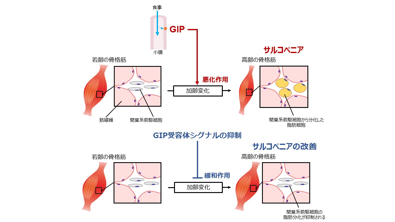 食後に分泌が増加する消化管ホルモンGIP (Gastric inhibitory polypeptide) が骨格筋の間葉系前駆細胞の脂肪分化を促進し、サルコペニア(老化による筋量・筋機能の低下)の一因となること、そして、このホルモンの作用シグナルを抑制することがサルコペニアの改善に繋がることを明らかにしました。本研究は、筋肉老化の新しいメカニズムを提示するのみならず、サルコペニアの新規治療法開発の基盤となることが期待されます。