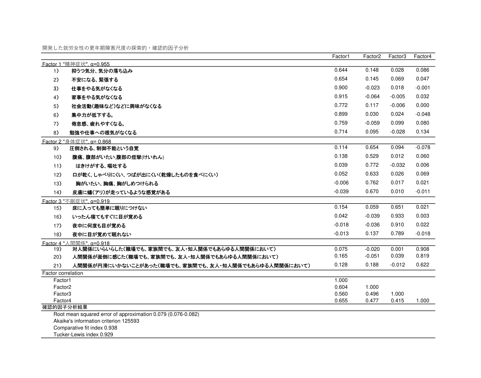 我が国の女性は、半数以上が非正規で雇用されており、キャリア構築が困難となっている。健康経営が政府主導で注目される中、女性の健康管理も健康経営優良法人の認定要件の一つとなった。しかしながら更年期障害は診断基準がなく、これまで客観的に判断ができなかった。開発した尺度は、身体症状、精神症状、不眠症状、人間関係の4つの領域の21項目で測定され、日本産婦人科学会が2001ねんに提唱した評価案とも強く相関した。またこの尺度は労働生産性のアブセンティーズム(欠勤)を予測することができる他、既に開発されている精神疲労尺度であるコペンハーゲンバーンアウト尺度とも強く相関が確認できた。