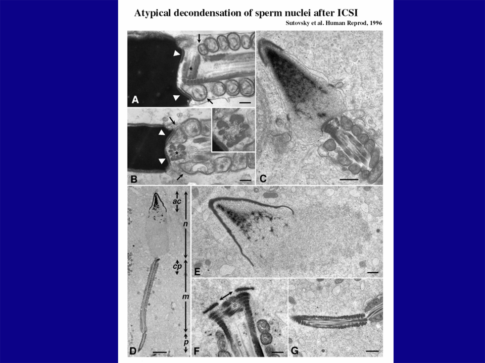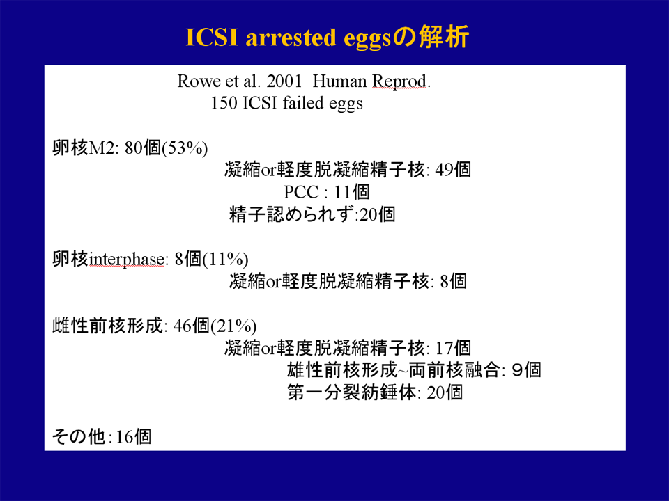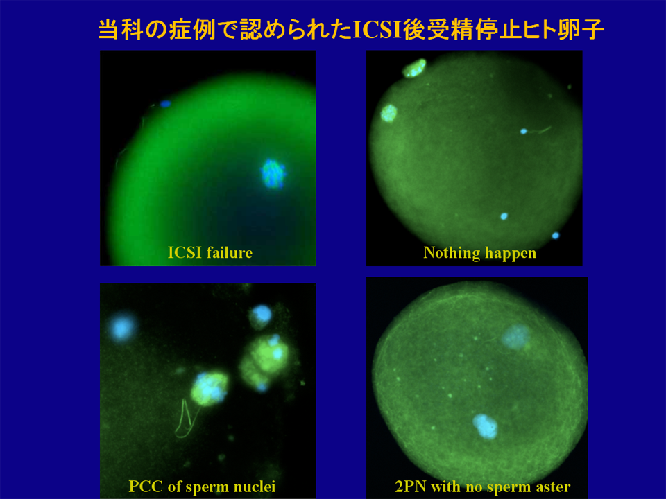 ICSIはここ10年来急速に不妊症臨床に導入され、本邦においては体外受精とほぼ同数が施行され、ほぼ同様の成果が得られている。注入ピペット等も極めて繊細なものが市販され平易に手に入るようになり、少なくとも技術的にはかなり安定したものになった感はある。しかし、ICSIをもってしても受精の成立すら至らない症例も多数存在することが明らかになってきている。図3に私たちが検討したICSI後の受精停止卵子のいくつかを示す。更には、ICSIの導入により不妊症の治療対象は増加したことは事実であるが、その成功率はここ10数 年ほとんど横ばいである。すなわち、ICSIとは受精のほんの始まりの部分をバイパス(アシスト)する手技にすぎず、妊孕性自体を向上させるものではない、と言える。