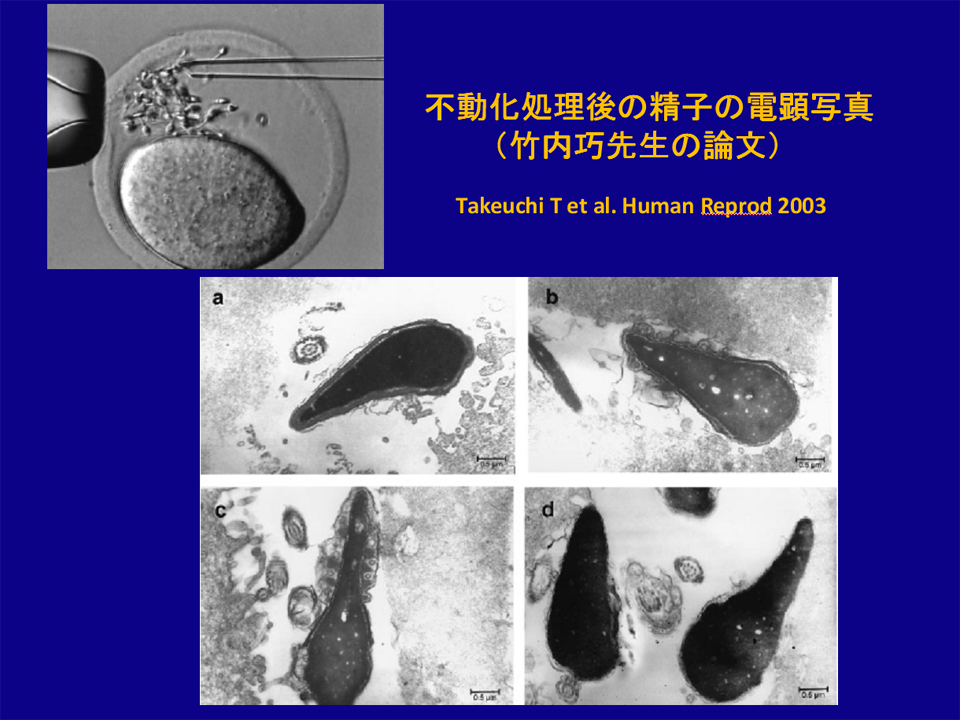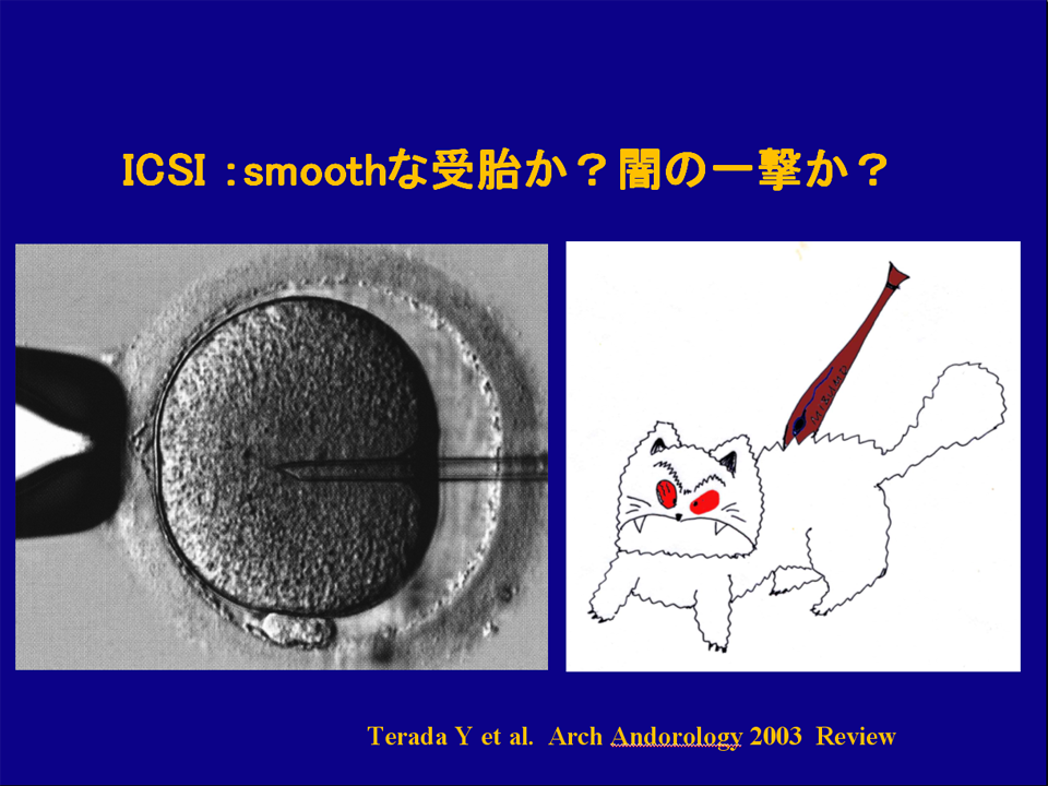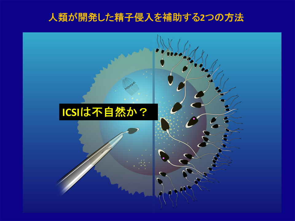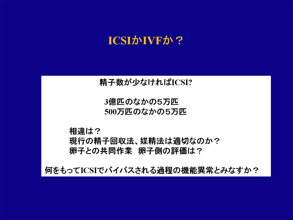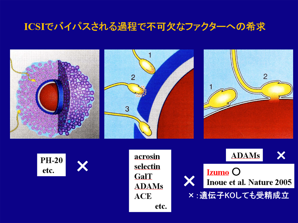 図4に 示されるICSIとIVFの相違を卵子側と精子側の観点より考えてみる。ICSIとIVFの相違は端的に表現すると「ICSIとは精子が通常の受精で顆粒膜細胞、卵子透明体、囲卵腔、卵子細胞膜を通過するときに精子、卵子それぞれに起こるmodificationが起こらずに精子が卵子細胞質内に存在する状態」といえる。 これらの相異により起こりうる事象を図5から図8までに示す。図5はサルICSI後の精子核の脱凝縮の状況を示した電顕像である。ICSIの場合、精子先体などの精子核からの脱離が起こっていないため精子核先端部分の脱凝縮が遅延しているのが理解できる。さらに図6はヒト精子のIVF後とICSI後のDNA合成期へのエントリーを検討したものである。IVF時には雌雄の前核の細胞周期はシンクロし、同時期にDNA合成を行っているが、ICSIでは雄性前核のDNA合成期へのエントリーは遅延している。受精という人生初の細胞周期でICSIは雌雄がシンクロしていない、ということになる。また、精子表面は種々の接着に関与する因子が存在していることがわかっている(図7)。精子表面にプラスミドDNAをまぶしICSIすることにより遺伝子導入が可能であり、それはIVFでは不能であることが報告されている(図8)。この事実は臨床のICSIの現場でも、予期せぬ外来遺伝子導入が起こってしまう可能性を現在は否定できないことを示唆する。ICSIとはまるで猫をバットで突き刺すような行為だ(図9)、とも表現はできるが、このようなスタンスからその有用性、安全性を検証してゆくことは重要であると考えている。以上の知見より導かれる臨床的なスタンスはやはりIVFで受精が望める症例は、ICSIは回避するということであろう(図10)。しかし、残念ながら明瞭にIVFとICSIを振り分けうる適切なアッセイは存在しない。図11にICSIでバイパスされる受精のプロセスで機能が確認されている分子を示す。しかし、マウスでこれらの分子をノックアウトしたモデルを作成しても受精は成立してしまう。そのような中、大阪大学の岡部勝教授のチームが同定したIzumoは精子、卵子のフュージョンにエッセンシャルなものであることが報告された。私たちはこの分子の精子における発現の有無がIVFとICSIの適応を決める候補となりうる、という大きな期待を抱いて不妊男性の精子におけるIzumoの発現を検討した。検討した症例は臨床上IVFで受精がまったく成立せず、ICSIにて受精が成立した症例のストックした精子である。結果は残念ながら、検討したすべての精子にIzumoは発現し、これらの症例中に少なくともタンパクレベルでの欠損症例は存在しなかった(図12)。この検討で我々が思い知ったのは、連綿と継代されてきた種の配偶子の機能を単一の分子で評価すること自体不可能であることである。今回検討した限りで、現存する男性精子のすべてにIzumoが発現している事実は逆にこの分子の重要性を裏付ける結果になったとも考えている。
