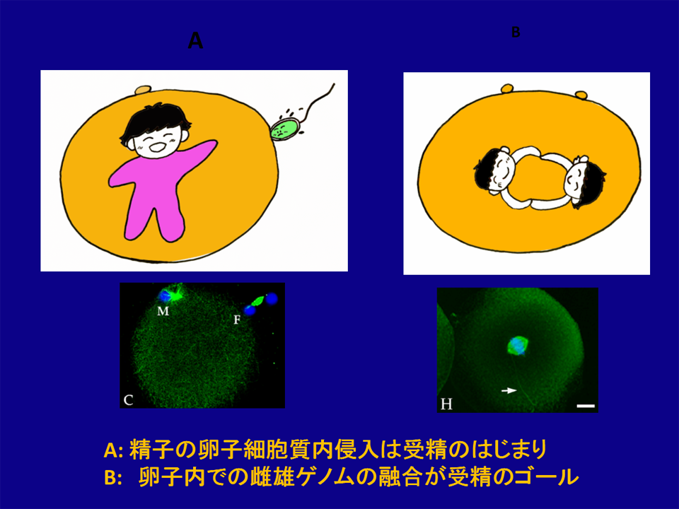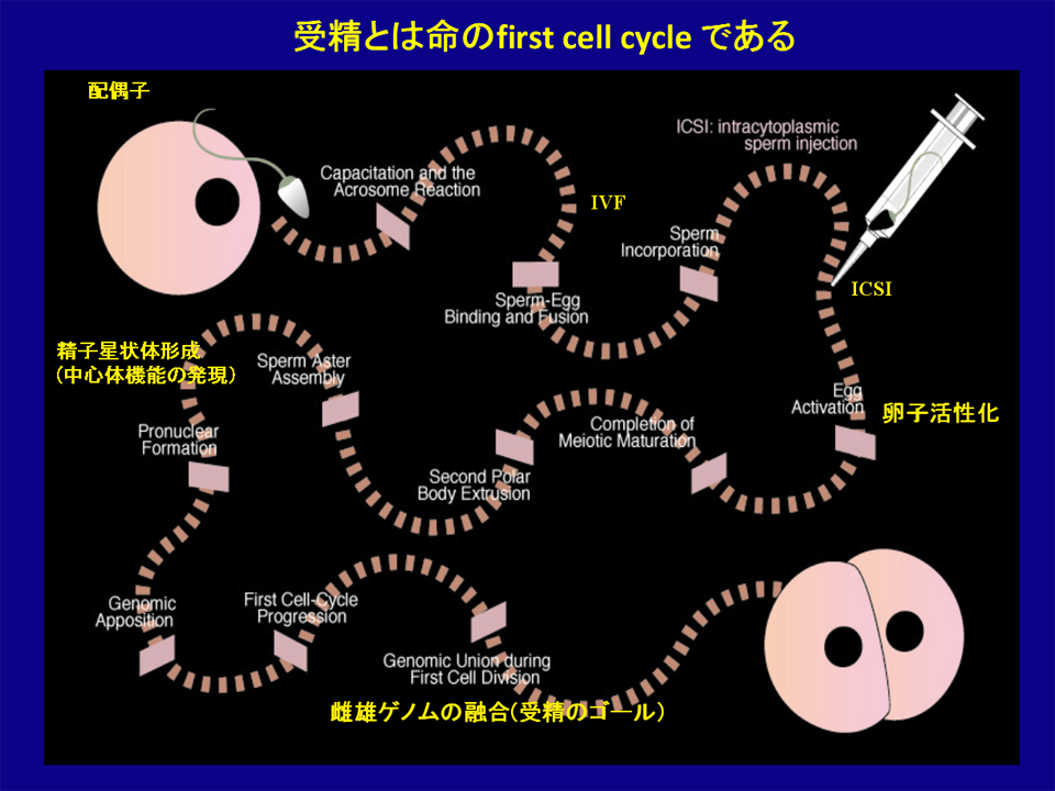 受精とは雌雄の遺伝情報が合一して新しい生命が誕生することと定義され、受精のゴールである雌雄ゲノムの合一までには卵子活性化より始まる種々の過程が存在する。それらの過程をpost ICSI events in fertilization (PIEIF)と総称する(図13, 14)。 受精を配偶子同士が接触した瞬間よりとするならば、PIEIFは過程全体の殆どの時間を占めることになる。この期間に分裂期(卵子核)、休止期(精子核)とそれぞれ異なる周期の配偶子の核は前核を形成し、DNAを倍加させ(S期)、融合する。すなわち、受精とは生命の最初の細胞周期 (first cell cycle of life) の発動とも換言できる。