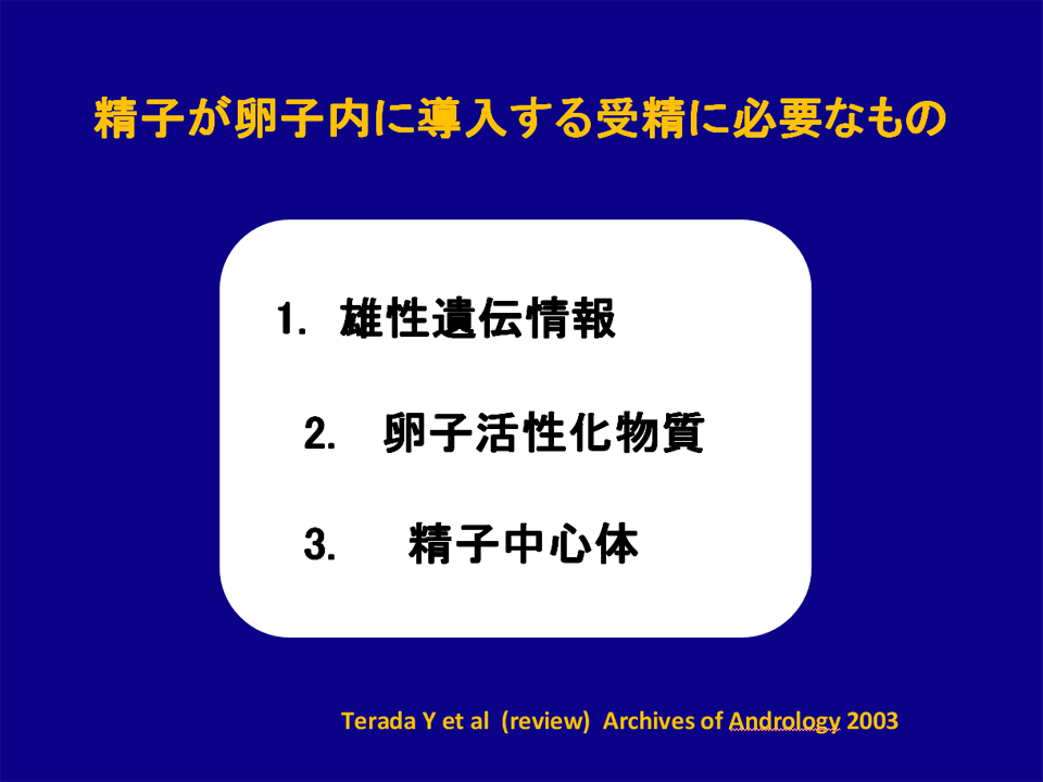 受精をFirst cell cycle として俯瞰するならば、ICSIでバイパスしうる精子の卵子細胞質内侵入は受精の極めて初期のイベントであることが理解できよう。PIEIFに関する解析が深まるにつれて、精子が卵子内に導入する雄性ゲノム以外のファクターの機能が注目されている。精子の構造を頭部から概観すると、精子先体、精子核、核を 分厚く覆うように存在するperinuclear material、精子中片部の中心体とミトコンドリア鞘、精子尾部となる。これらの構造のうち、精子先体を除くものが受精時卵子内に導入される。但し、 ICSIでは精子先体もそのまま導入されるケースが多いと考えられる(不動化処理により、頭部より外れてしまうものも多い:図15)。これら各々のパーツが受精すなわち、雌雄ゲノムの卵子細胞質内での融合のために種々の機能を持っているのである。また、異種の細胞成分が最終的に同一の細胞周期内に取り込まれるためには、各々が協調して機能を発現することが必要である。現在までにそのような因子として同定されているのが、卵子活性化因子と中心体である(図16)。ICSIを施行 したにもかかわらず、その後の受精過程が進行しなかったヒト卵子を解析するとその6-7割は卵子活性化障害である。残りの卵子では活性化が開始した後の停止がみとめられる(図3, 17)。