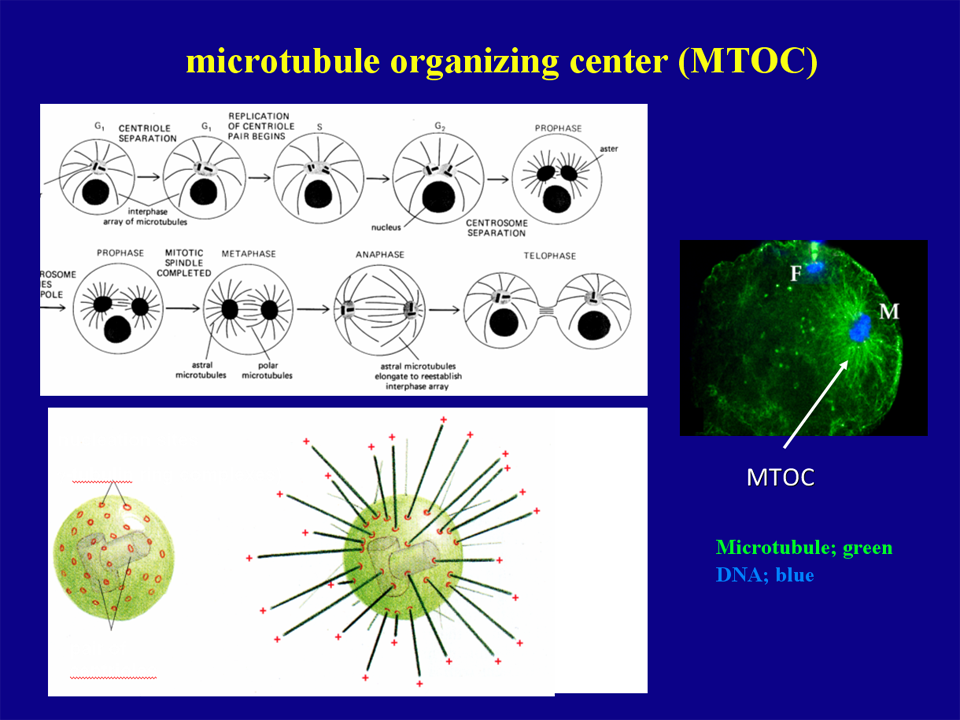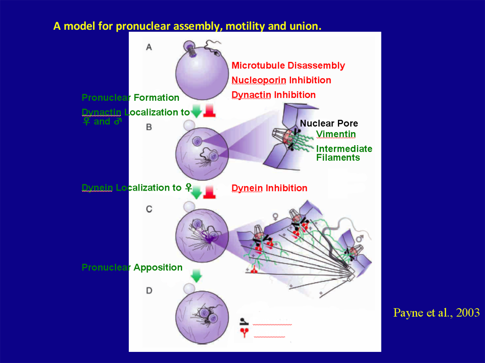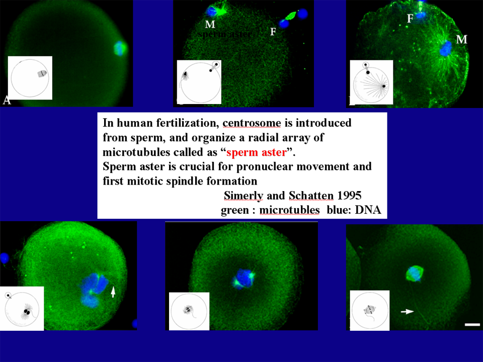 図21にヒト受精における微小管の形成を示す。卵子内に侵入した中心体より放射状の微小管の束、すなわち精子星状体 (sperm aster)が形成される。雌性前核には微小管のmotor protein(微小管をレールとすると荷物を運ぶトロッコ列車の役割を果たす)の存在が確認されており、雌雄前核融合にむけた動きをプロモートする。ウシ雌性前核表面にはdynactin、雄性前核表面にはdyneinの存在が明らかになっており、図22, 23に示すごとく雌雄の融合に関与していると考えられている。また、微小管の放射状の構造はゲノムが卵子の中心を知るうえでは合理的であると考えられる。すなわち、最終的に卵子内 に360度方向に形成された微小管の斥力が卵子の中心でつり合い、雌雄ゲノムはそこに導かれるのである。雌雄前核は卵子中心で融合して精子中心体は分裂 し、第一分裂紡錘体が形成される。