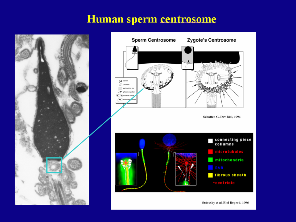 哺乳動物の卵子には形態的な中心体(すなわち中心小体と周辺のpericentriolar matrix: PCM)は存在しない。受精、すなわちfirst cell cycle of lifeに必要な微小管形成中心(microtubule organizing center: MTOC:図18)としての中心体は精子が導入するのである。精子中心体の構造と機能発現を図19, 20に示す。精子中心体は頸部に存在し、2対の中心子(centriole)とその周囲の様々な中心子周辺蛋白から構成されるPCMから成る複合体である。PCM には微小管形成に関わる種々のタンパクが存在し、卵子細胞質内でそれらがリン酸化されることにより機能を発現すると考えられている。