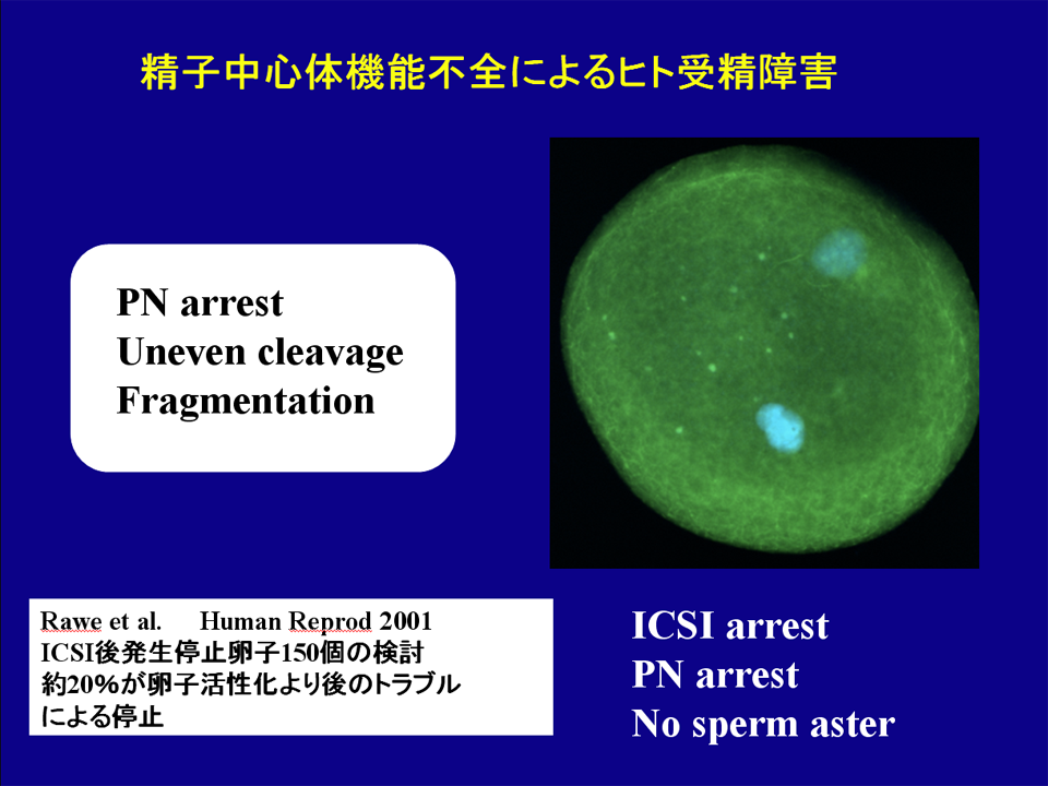 ICSI後の発育停止卵子の解析より精子中心体機能不全が存在することが明らかにされている(図26)。我々は哺乳動物卵子細胞質を用いて精子中心体機能を測定するシステムを開発した。まず、ヒトの精子をウサギあるいはウシ卵へ顕微注入し異種間においてもヒトの精子がsperm asterを形成することを示した。ウシ卵子内でのヒト精子星状体の形成を図27に示す。次いで、臨床の不妊症例の余剰精子ではコントロールのドナー精子と比較して星状体形成率が優位に低いことを明らかにした。さらに、臨床の精液検査のパラメーター(精子数、運動率)、臨床IVFでの前核形成率、分割率と星状体形成率を比較したところ、精液検査のパラメーターや前核形成率とは相関せず、前核形成胚の分割率と相関した。つまり高分割率群が低分割率群より星状体形成率が優位に高い結果が得られた。このことによりこのアッセイは受精後半の胚発生能を予測できる新しい精子機能検査であることが明らかとなった。