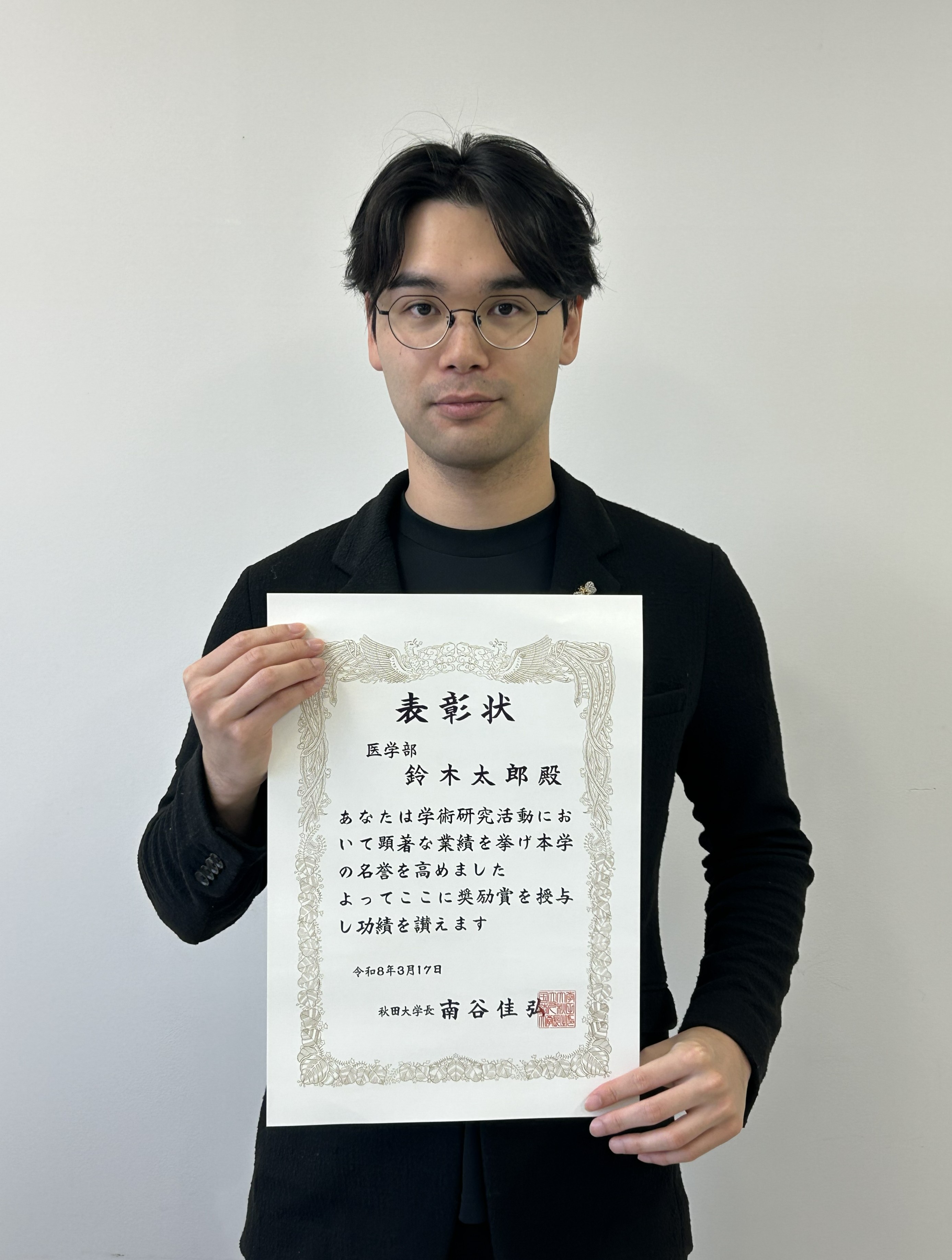 医学科6年次の鈴木 太郎さんが、「令和7年度秋田大学学生表彰」で奨励賞を受賞しました。 2026年3月30日(月)
