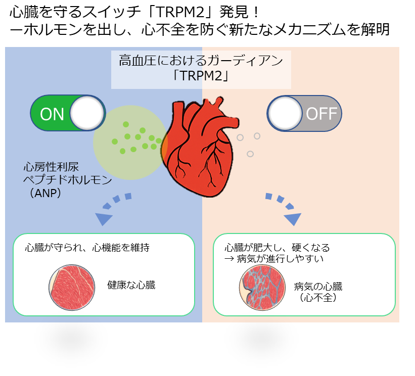 2026.1.14雑誌掲載沼田教授、田頭准教授、佐藤講師(医学部)らの論文が雑誌に掲載されました。 Atrial TRPM2 Channel-Mediated Ca2+ Influx Regulates ANP Secretion and Protects Against Isoproterenol-Induced Cardiac Hypertrophy and Fibrosis, Tomohiro Numata, Hideaki Tagashira, Kaori Sato-Numata, Meredith C Hermosura, Fumiha Abe, Ayako Sakai, Shinichiro Yamamoto, Hiroyuki Watanabe, Cells, 15(1):24, 2026 Cells:(link) この研究は、競輪の補助を受けて実施しました。 心臓は血液を送り出すだけでなく、体を守るホルモン「ANP」を分泌する働きも持っています。しかし、心臓がストレスを受けたときに、どのようにしてANPが放出されるのかは、これまでよく分かっていませんでした。本研究により、心房の細胞にある「TRPM2」という分子が、ストレスを感知してカルシウムを細胞内に取り込み、ANPの分泌を開始させる“スイッチ”として働くことが明らかになりました。TRPM2がうまく働かないとANPが十分に分泌されず、心臓が大きくなったり硬くなったりすることも分かりました。この発見は、心不全の予防や新しい治療法の開発につながることが期待されます。